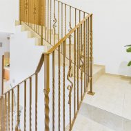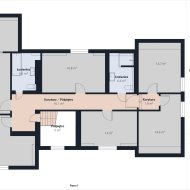 Na piętro prowadzą eleganckie schody. Tam czeka sześć sypialni w tym jedna z  atrakcyjnym pomieszczeniem idealnym na bibliotekę, pracownię lub garderobę oraz dwie łazienki.