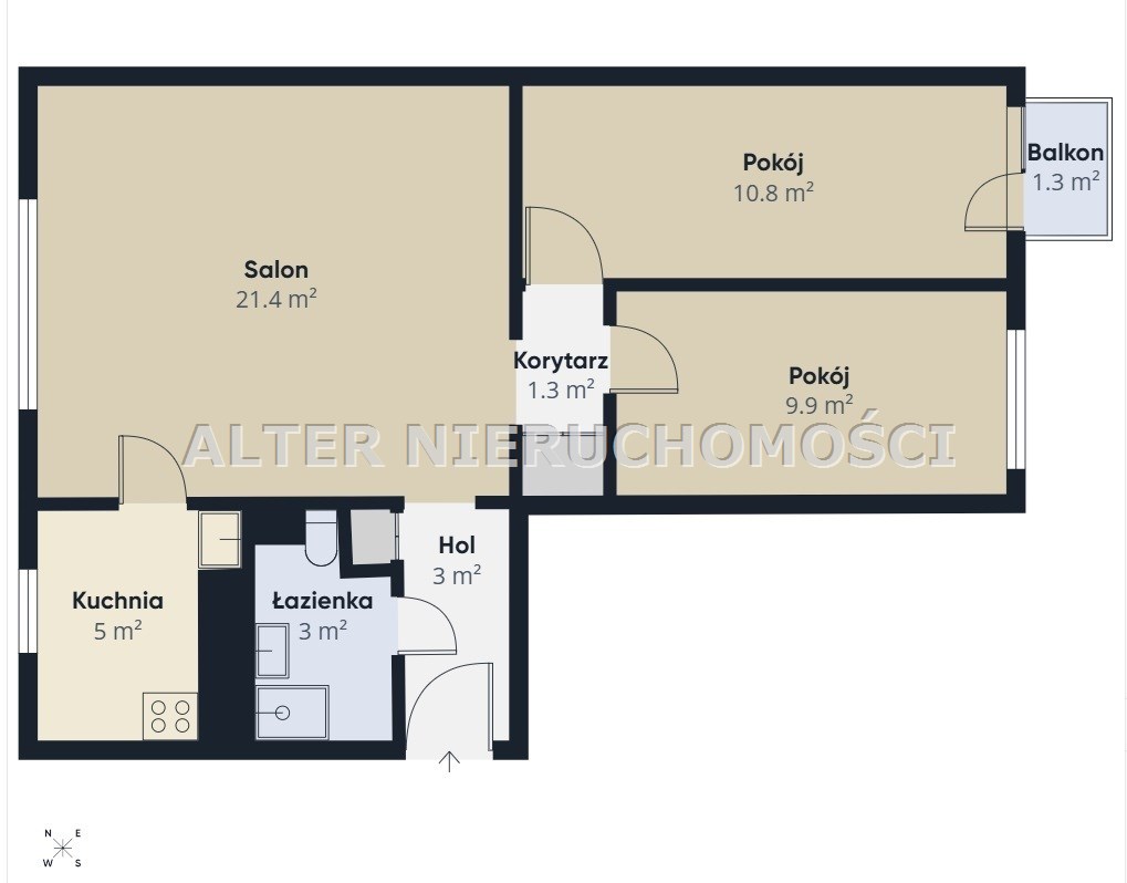 Układ pomieszczeń: strefę dzienną stanowi salon (21,4 m2) z przejściem do kuchni (5 m2) oraz niewielkiego korytarzyka, z którego wejdziesz do dwóch sypialni (10 i 11 m2), ponadto korytarz (3 m2) oraz łazienka (3 m2) z kabiną prysznicową.