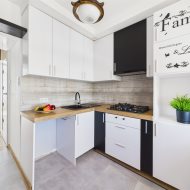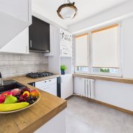 • Kuchnia (6 m²) – widna i funkcjonalna, z zabudową meblową i miejscem na piekarnik oraz zmywarkę. W przejściu wyodrębniono miejsce na ustawienie lodówko-zamrażarki tak, aby nie ograniczać przestrzeni w samej kuchni.