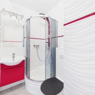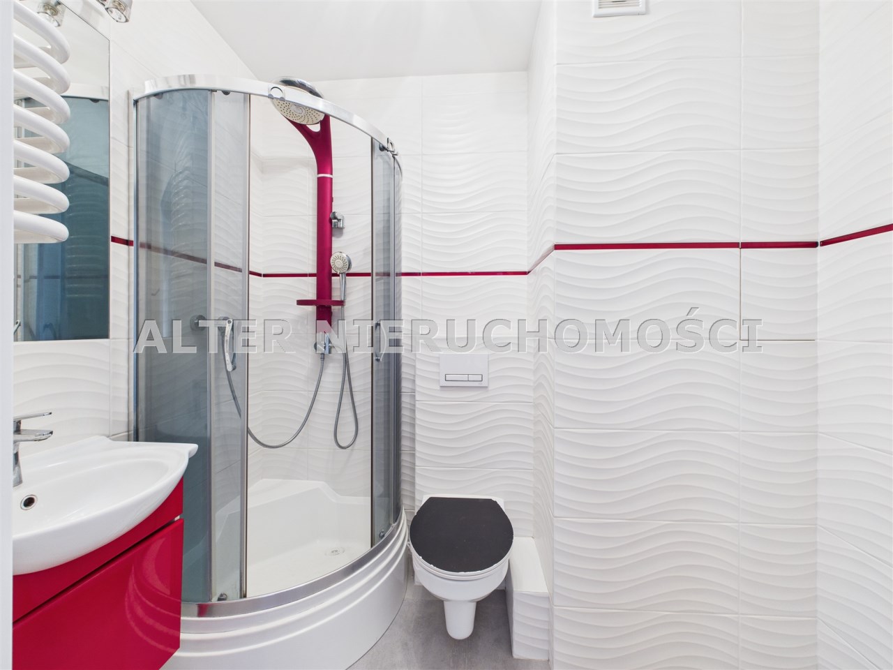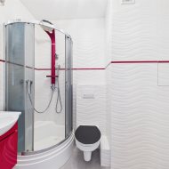 • Łazienka (3 m²) – z kabiną prysznicową, umywalką, WC oraz miejscem na pralkę.