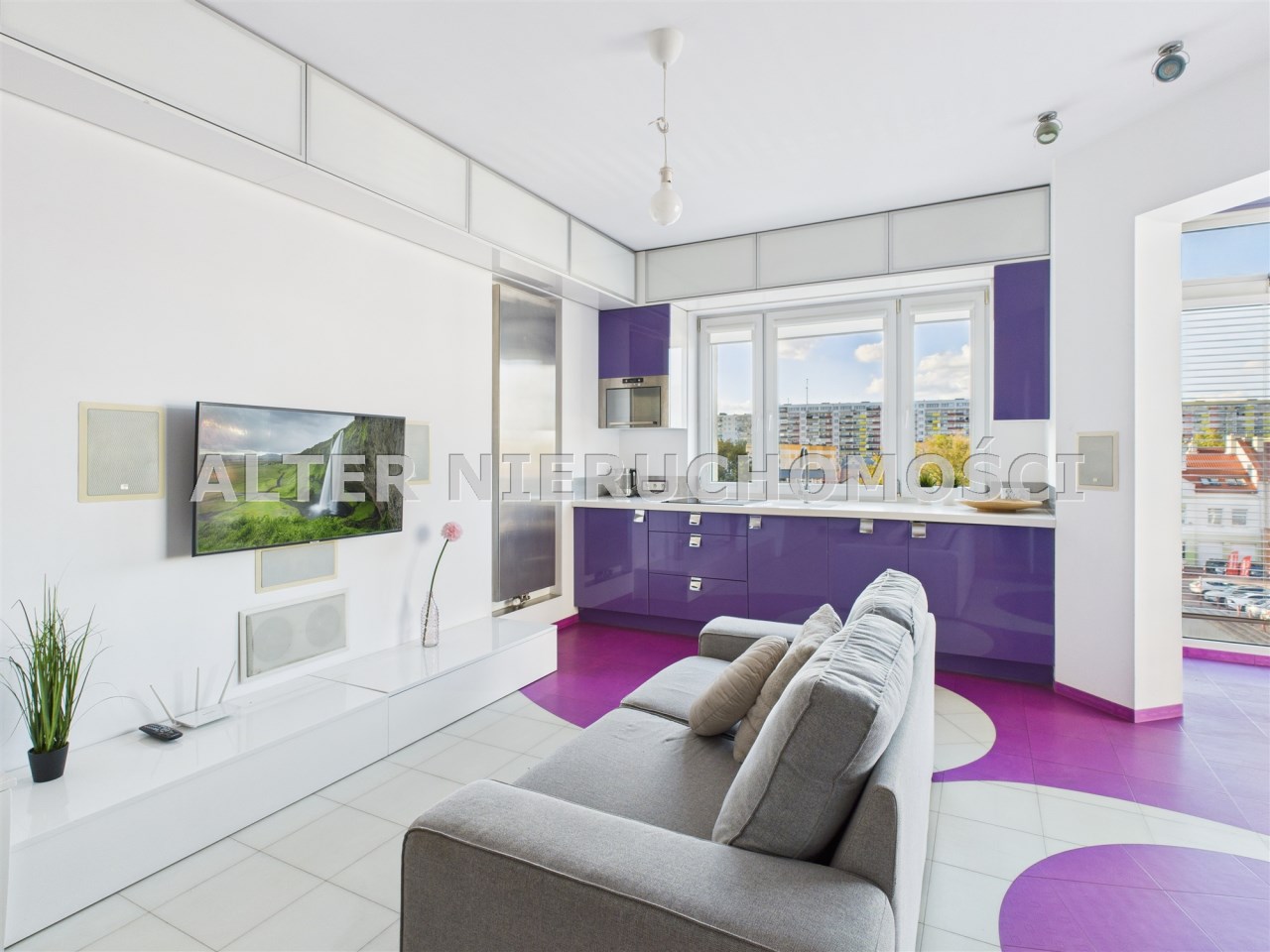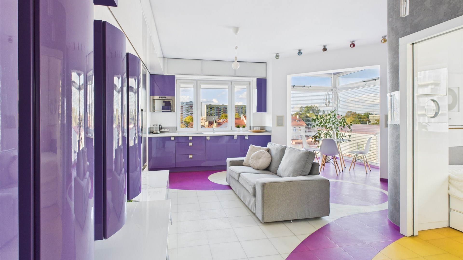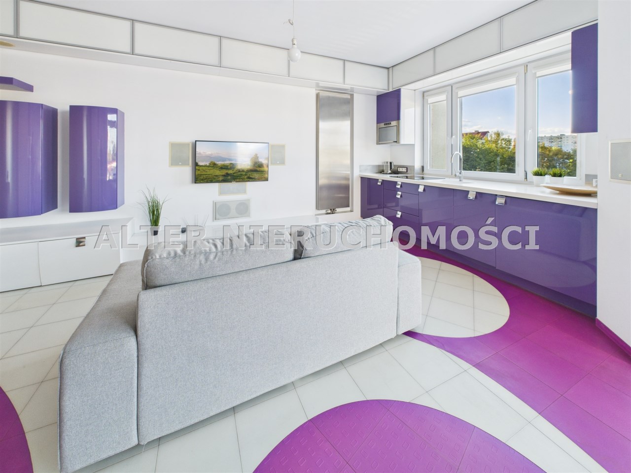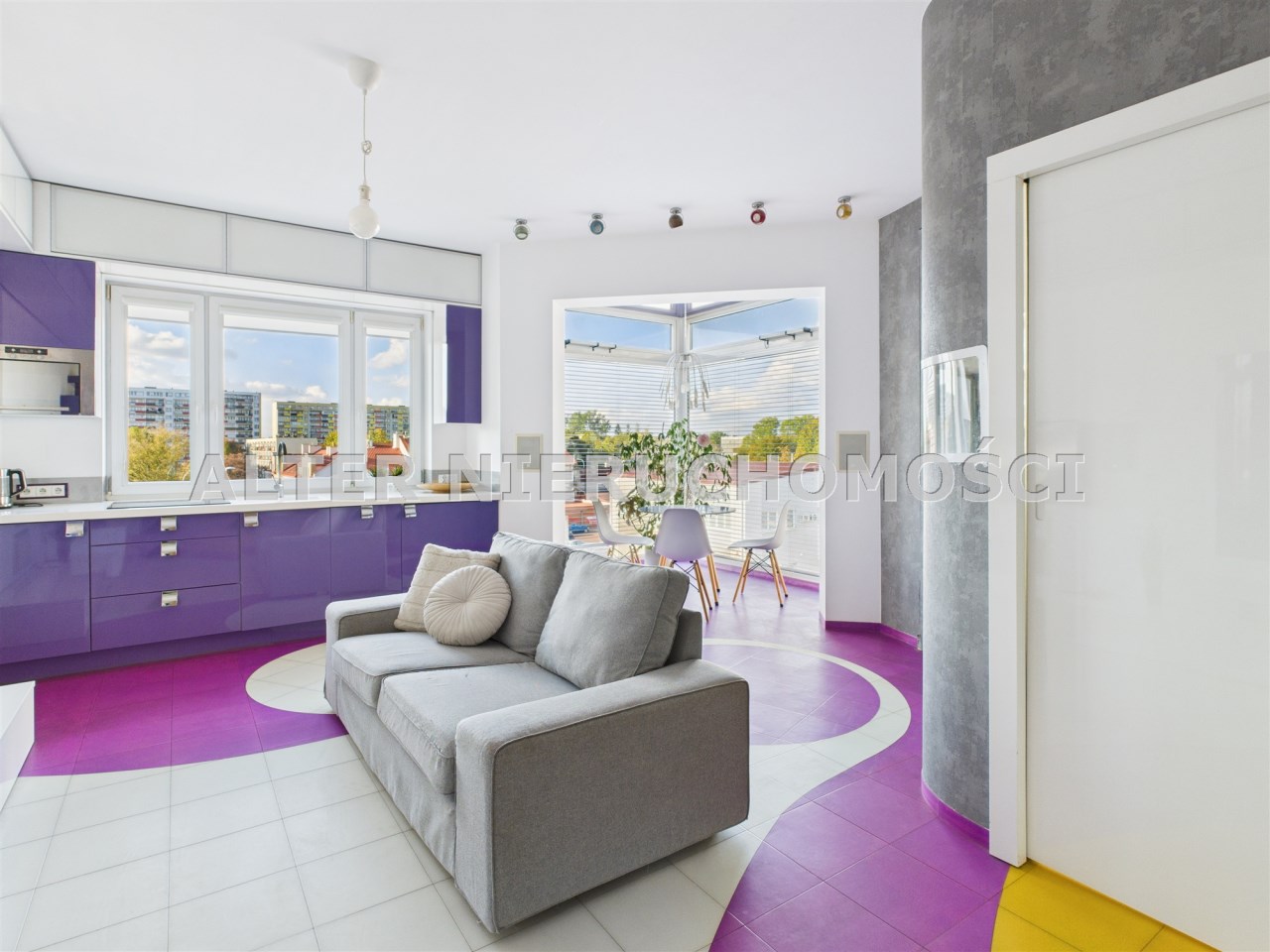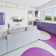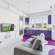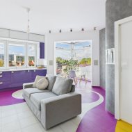 • Salon z aneksem kuchennym – nowoczesna, otwarta przestrzeń, idealna do życia i relaksu. Kuchnia w zabudowie, wyposażona w sprzęt AGD. Wnętrze spójne kolorystycznie – dominują odważne fiolety, biel i akcenty żółci, co nadaje całości artystycznego i energetycznego charakteru.