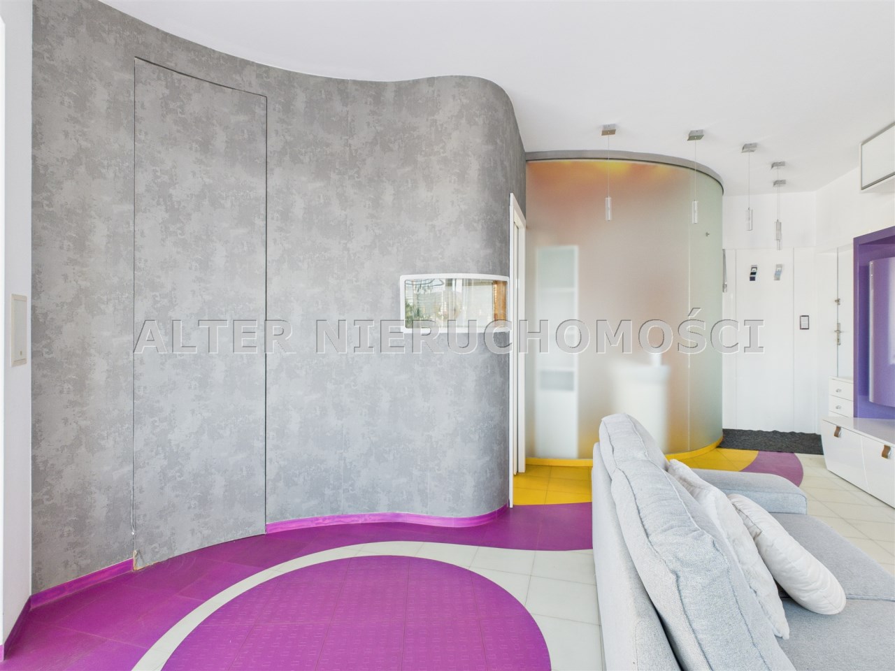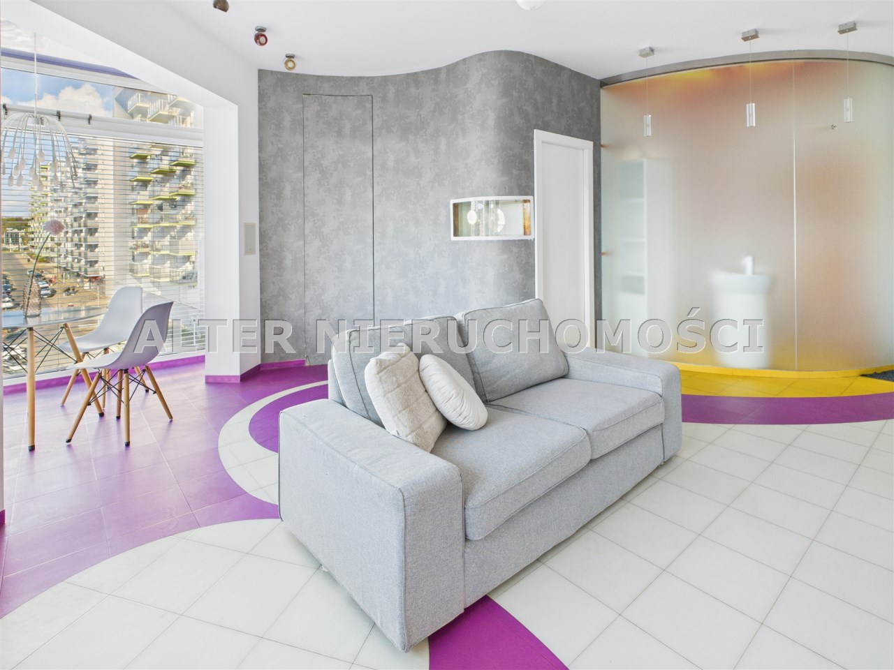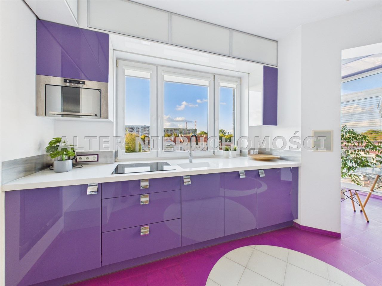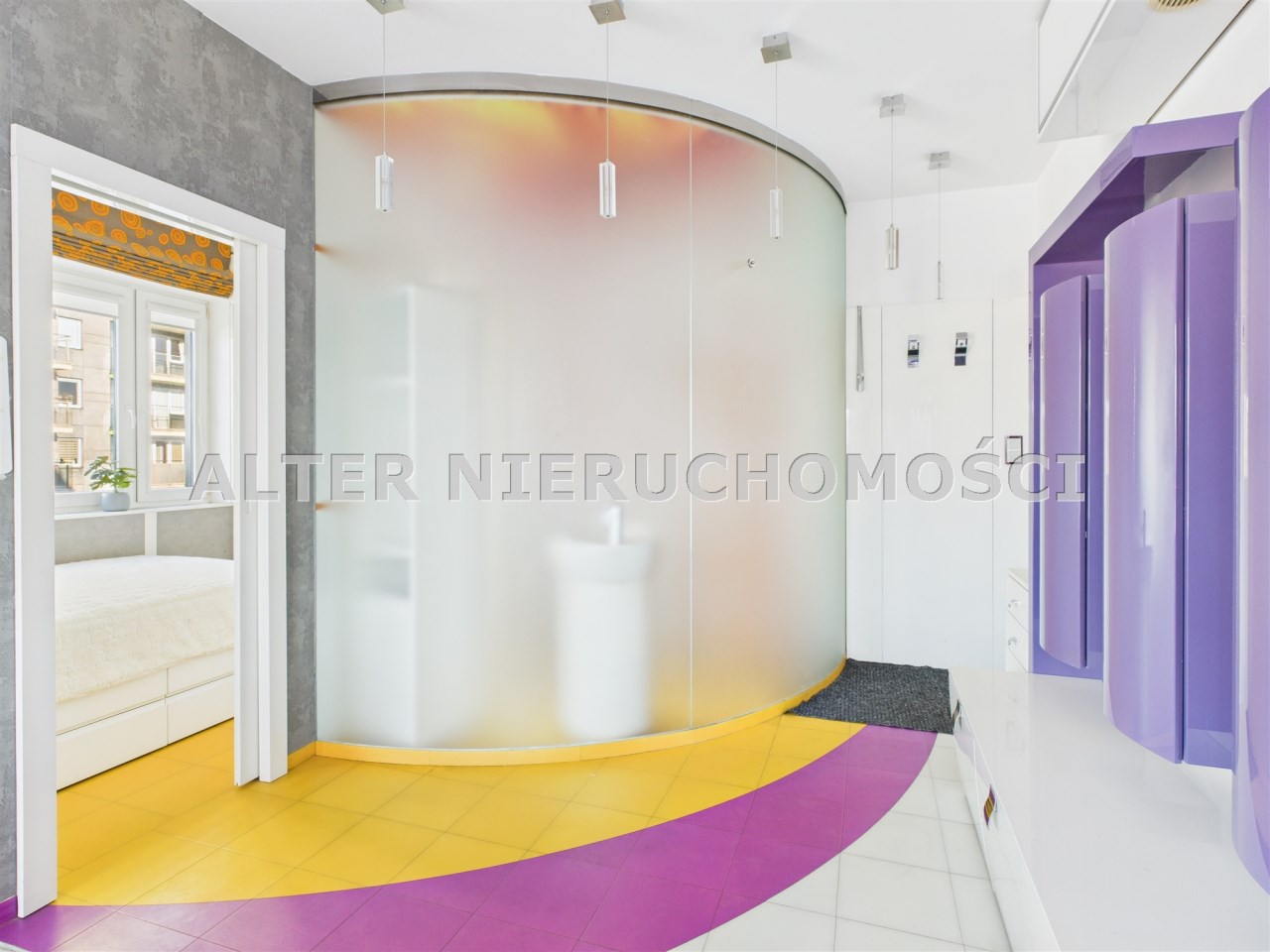 • Salon z aneksem kuchennym – nowoczesna, otwarta przestrzeń, idealna do życia i relaksu. Kuchnia w zabudowie, wyposażona w sprzęt AGD. Wnętrze spójne kolorystycznie – dominują odważne fiolety, biel i akcenty żółci, co nadaje całości artystycznego i energetycznego charakteru.