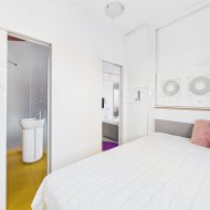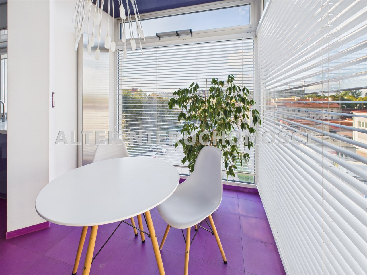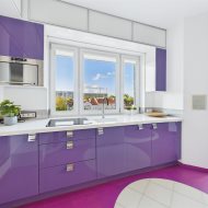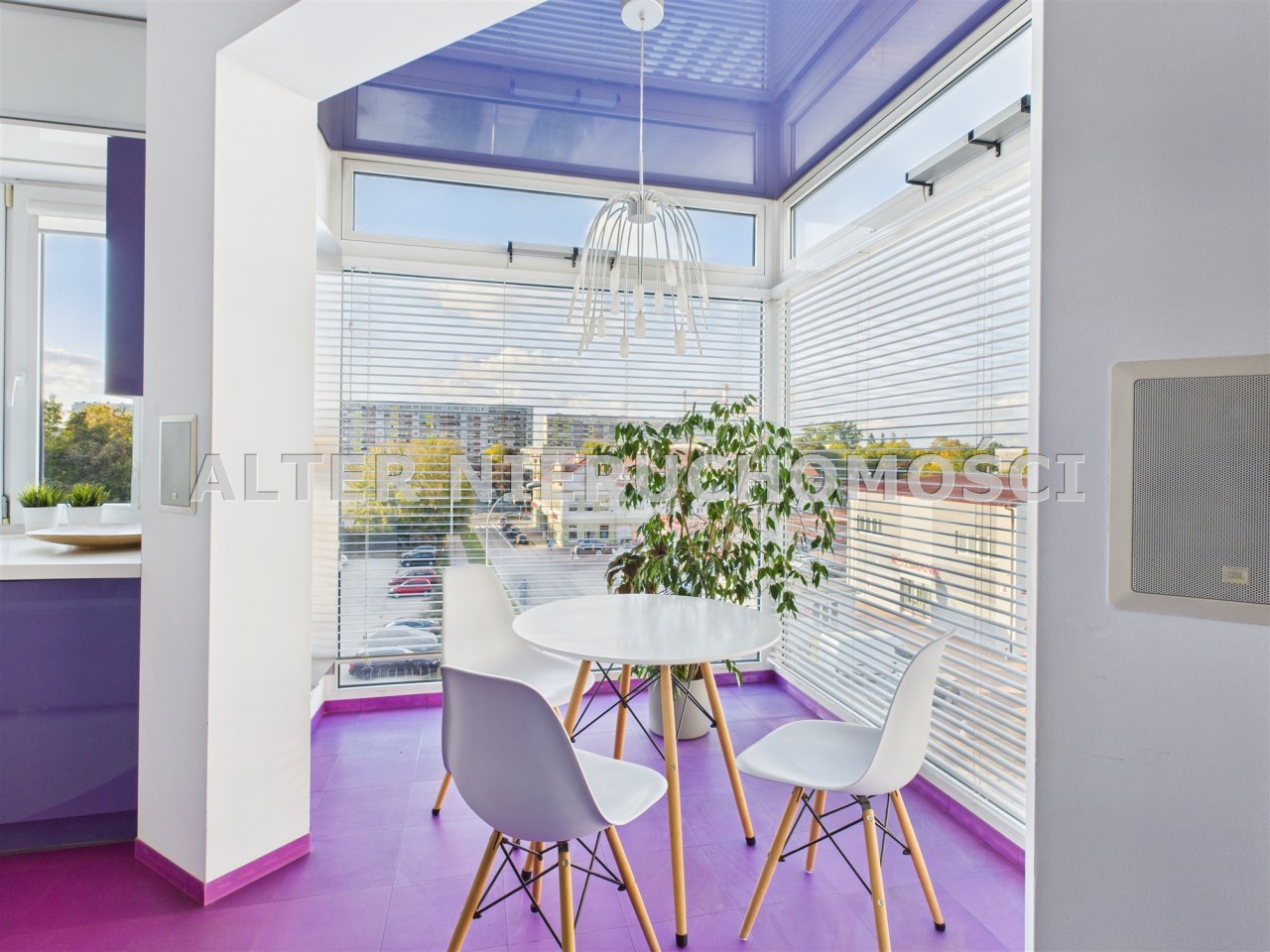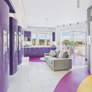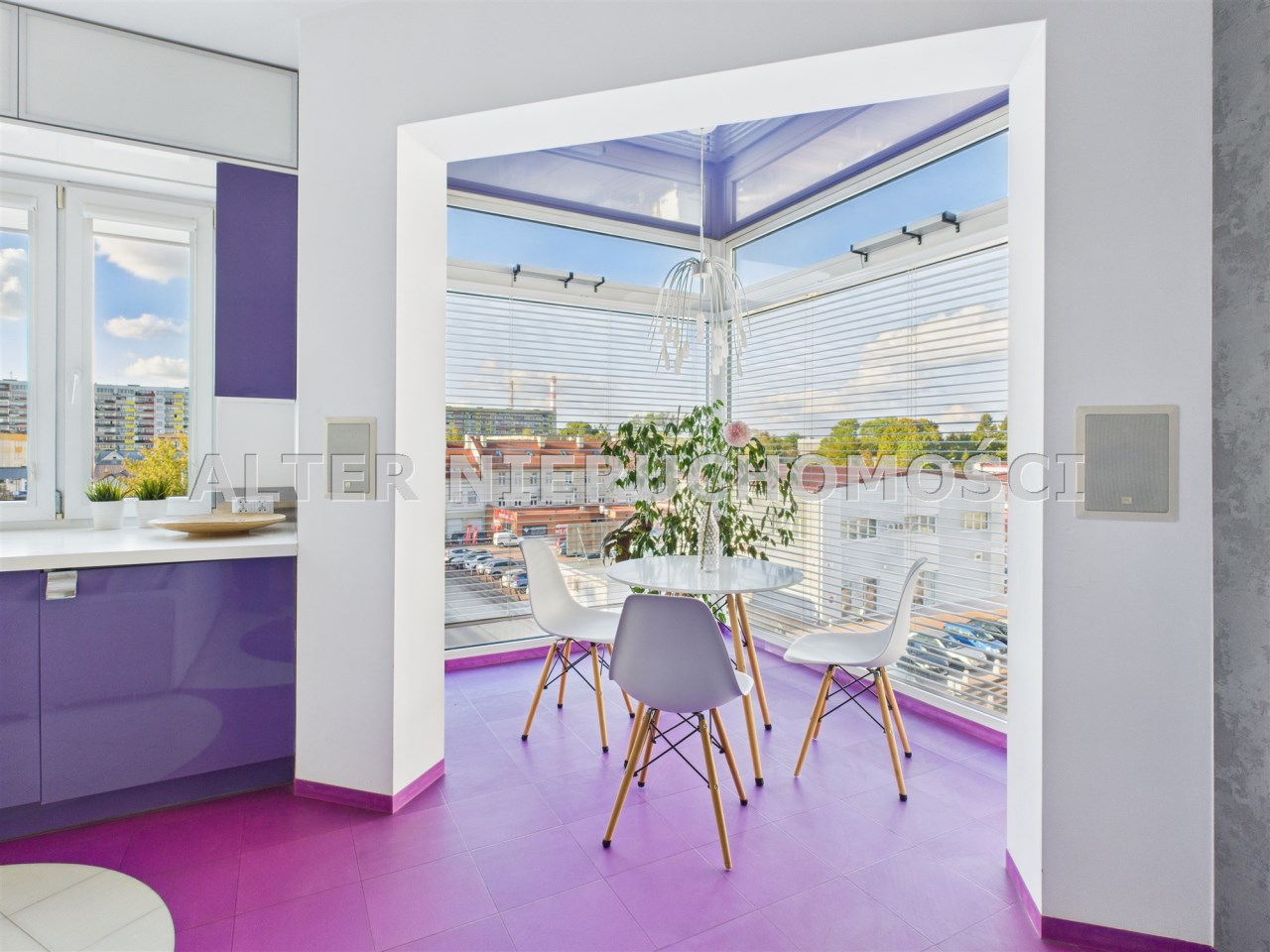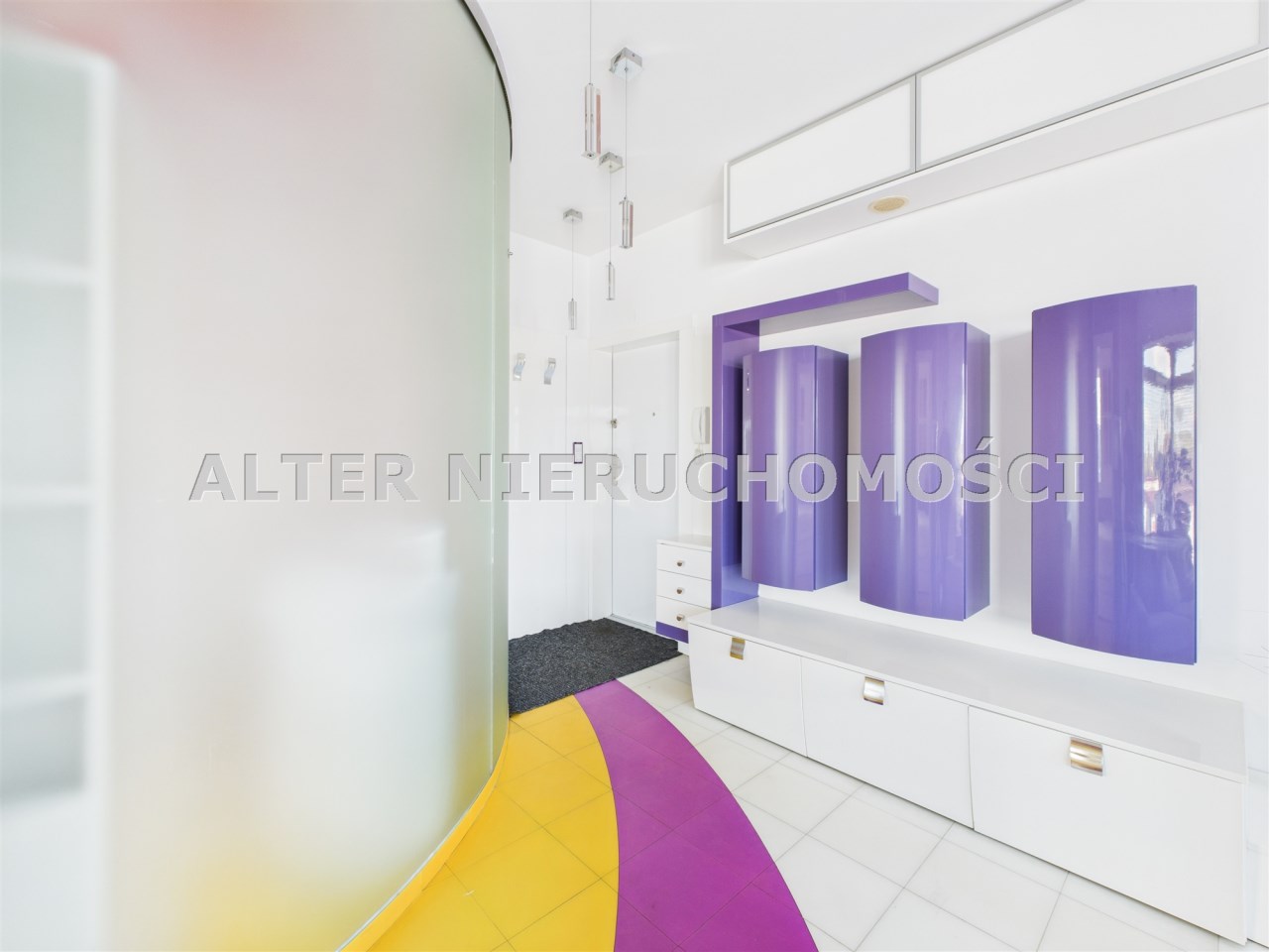 • Salon z aneksem kuchennym – nowoczesna, otwarta przestrzeń, idealna do życia i relaksu. Kuchnia w zabudowie, wyposażona w sprzęt AGD. Wnętrze spójne kolorystycznie – dominują odważne fiolety, biel i akcenty żółci, co nadaje całości artystycznego i energetycznego charakteru.