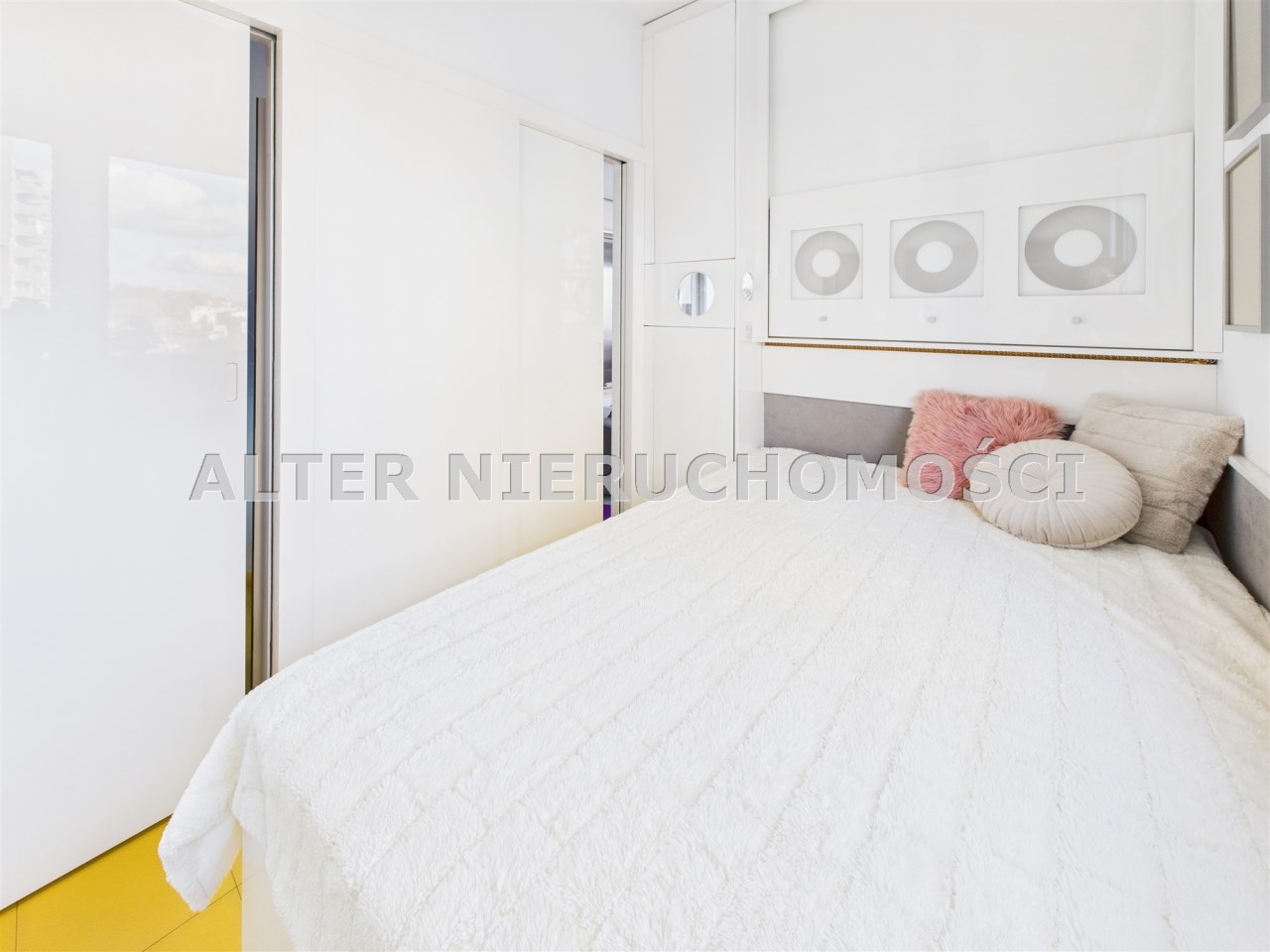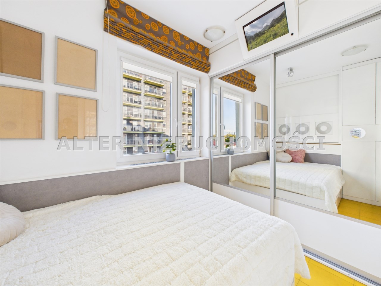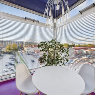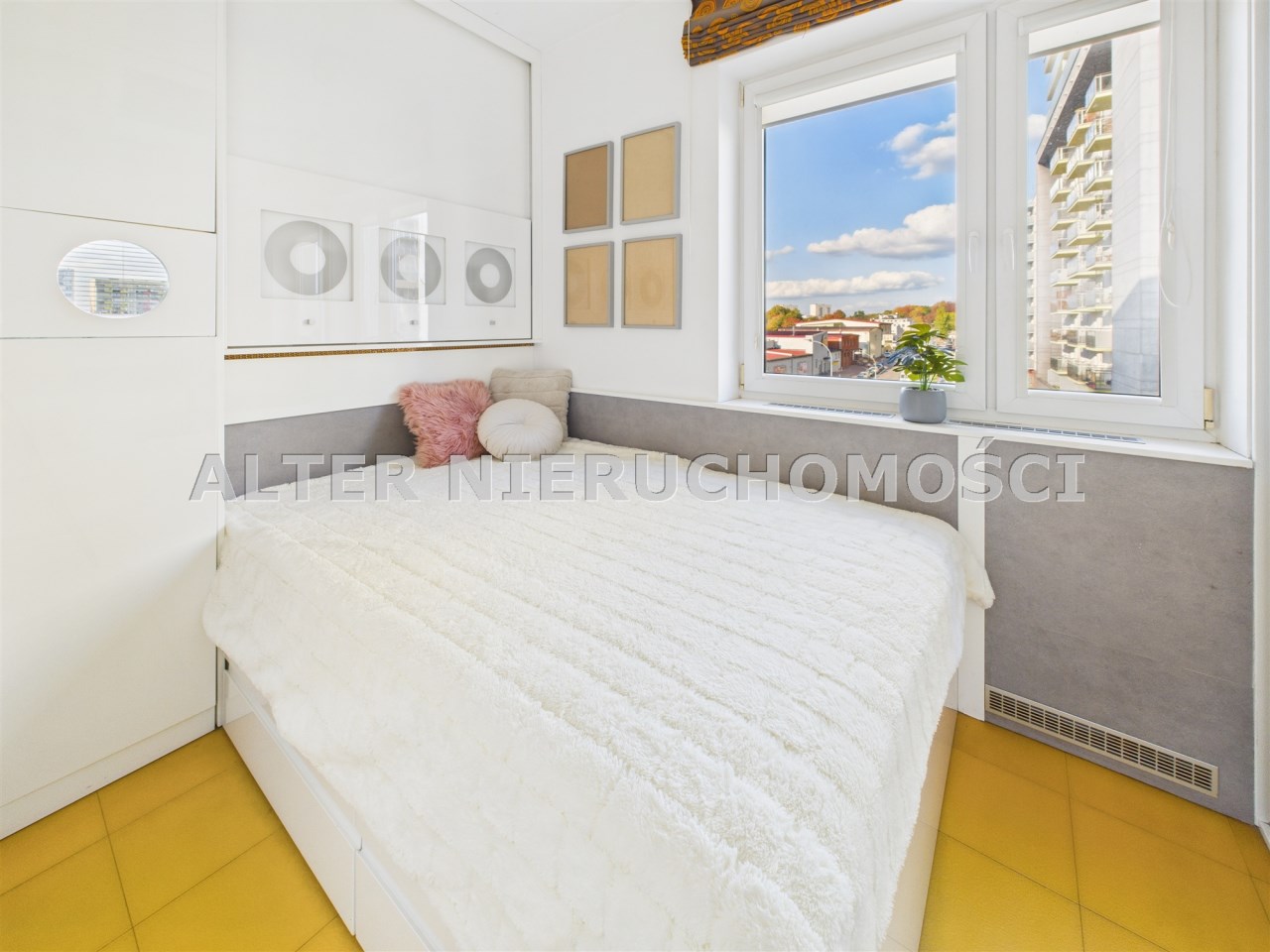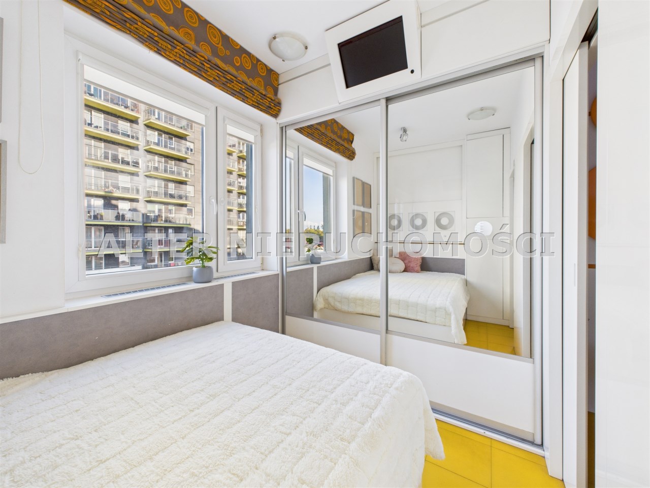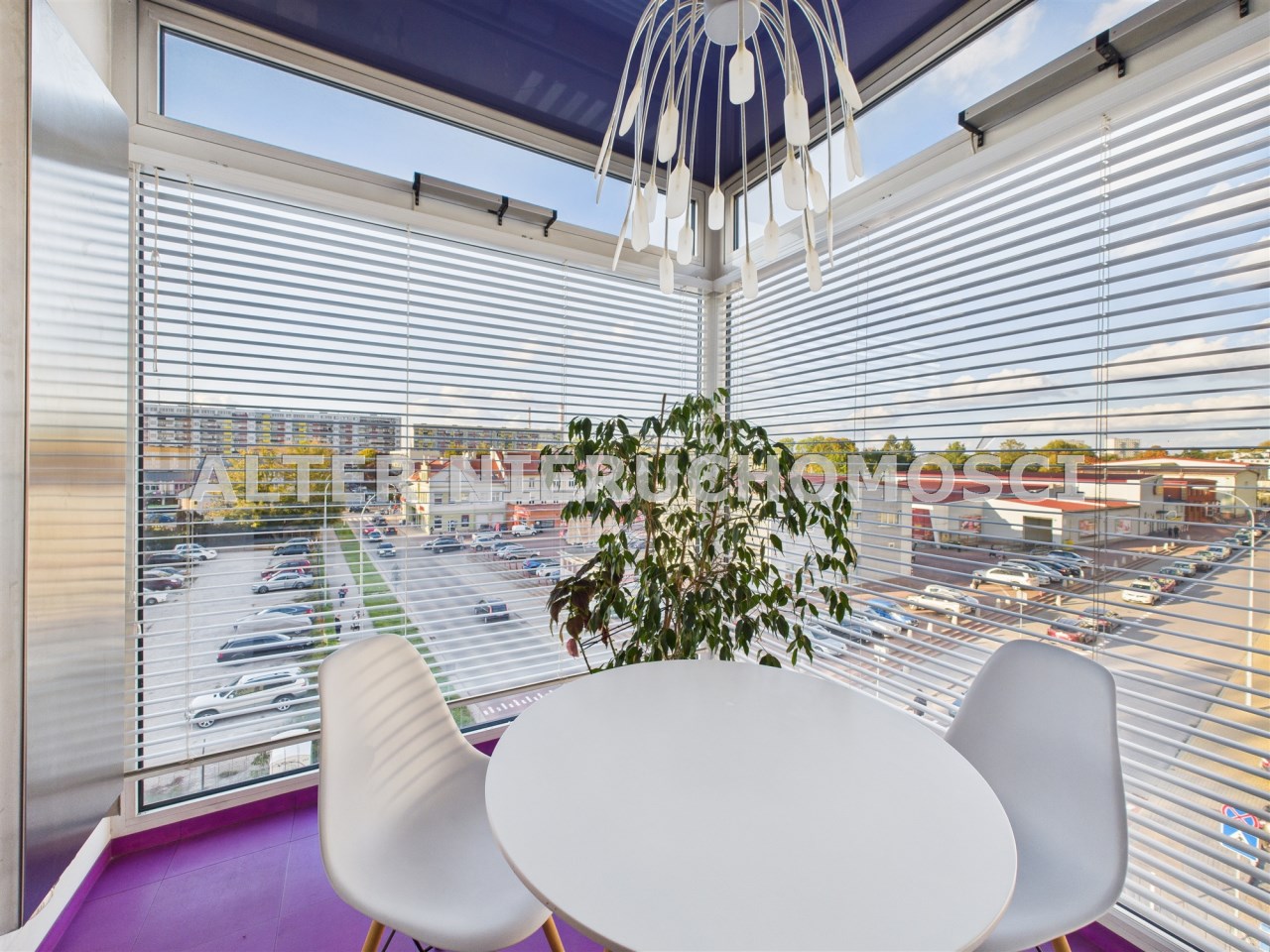 • Przeszklone patio zamiast balkonu – niecodzienne rozwiązanie z dużymi panoramicznymi oknami, które oferują widok na zadbane osiedle i wpuszczają mnóstwo naturalnego światła.