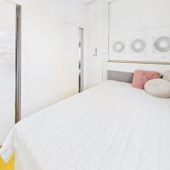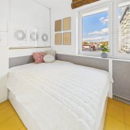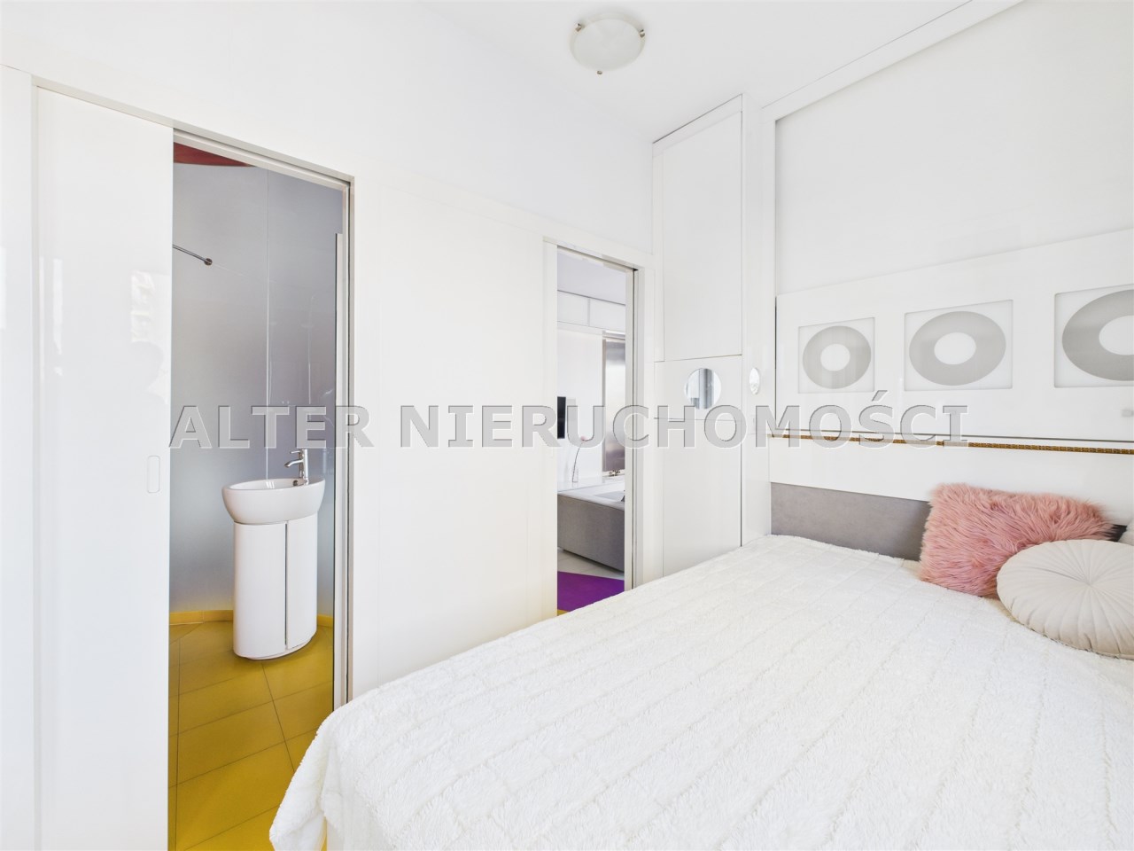 • Sypialnia – przytulna i funkcjonalna, z dużym łóżkiem i zabudowaną szafą. Bezpośrednie przejście do prywatnej łazienki, w której znajduje się nowoczesny prysznic, designerskie oświetlenie i oryginalne detale wykończeniowe.