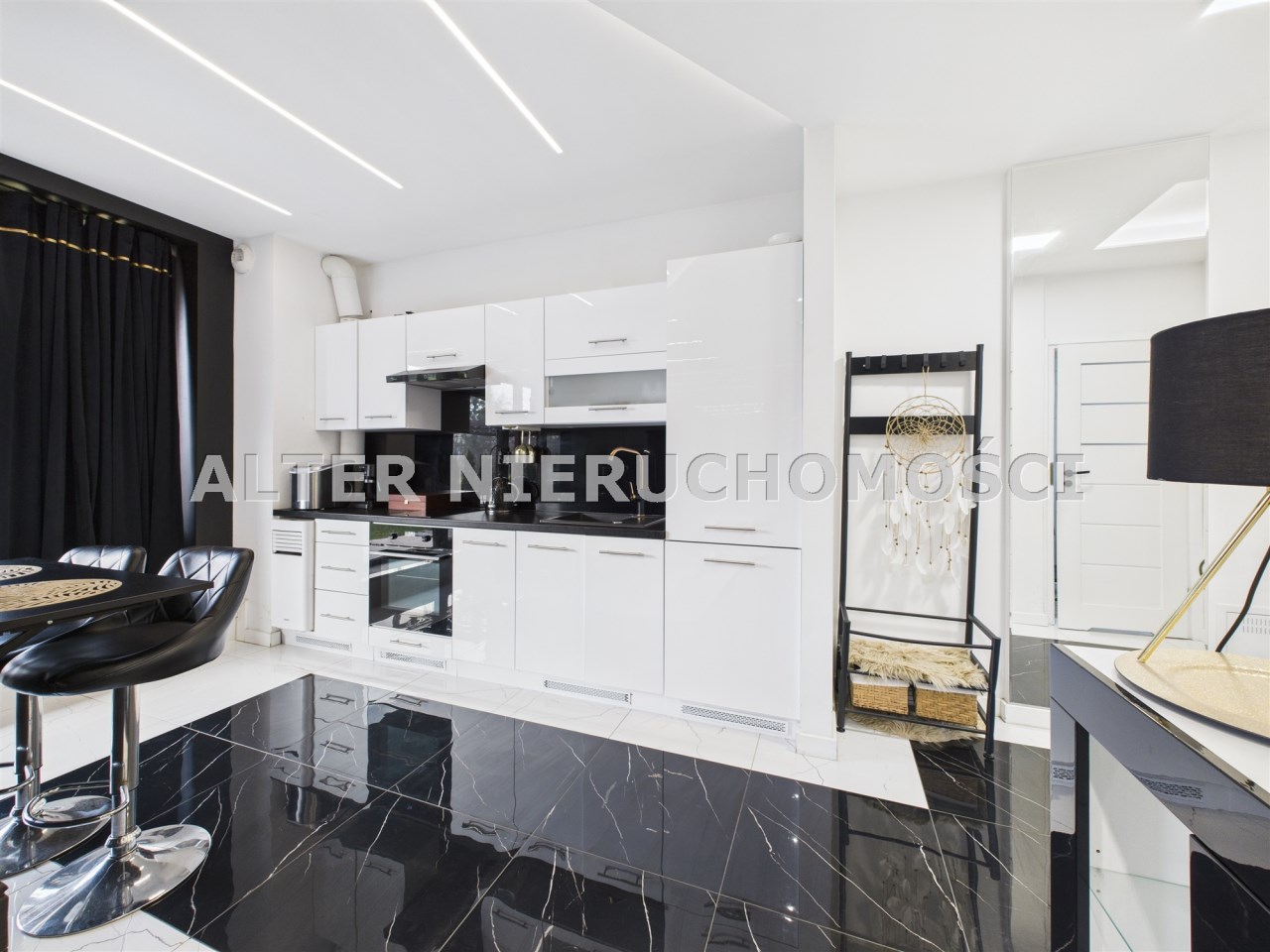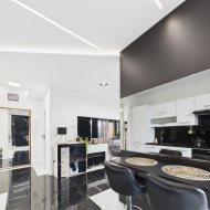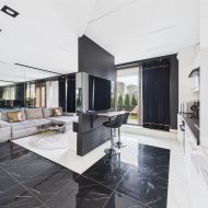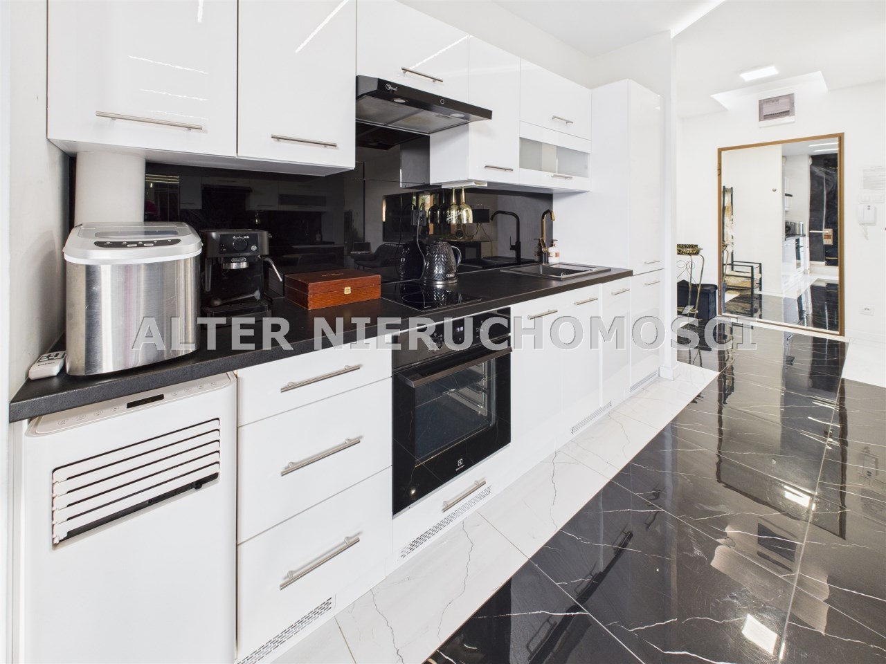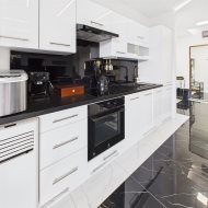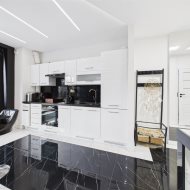 wyposażona kuchnia: ekspres do kawy, piekarnik, lodówkę wraz z zamrażalką, zmywarkę. To wszystko w otoczeniu luster i blasku.