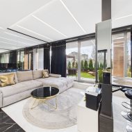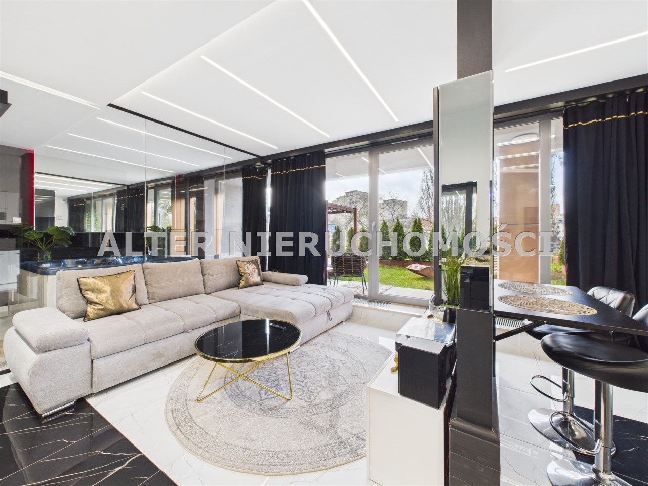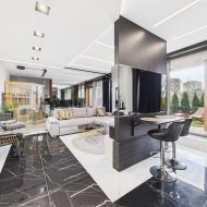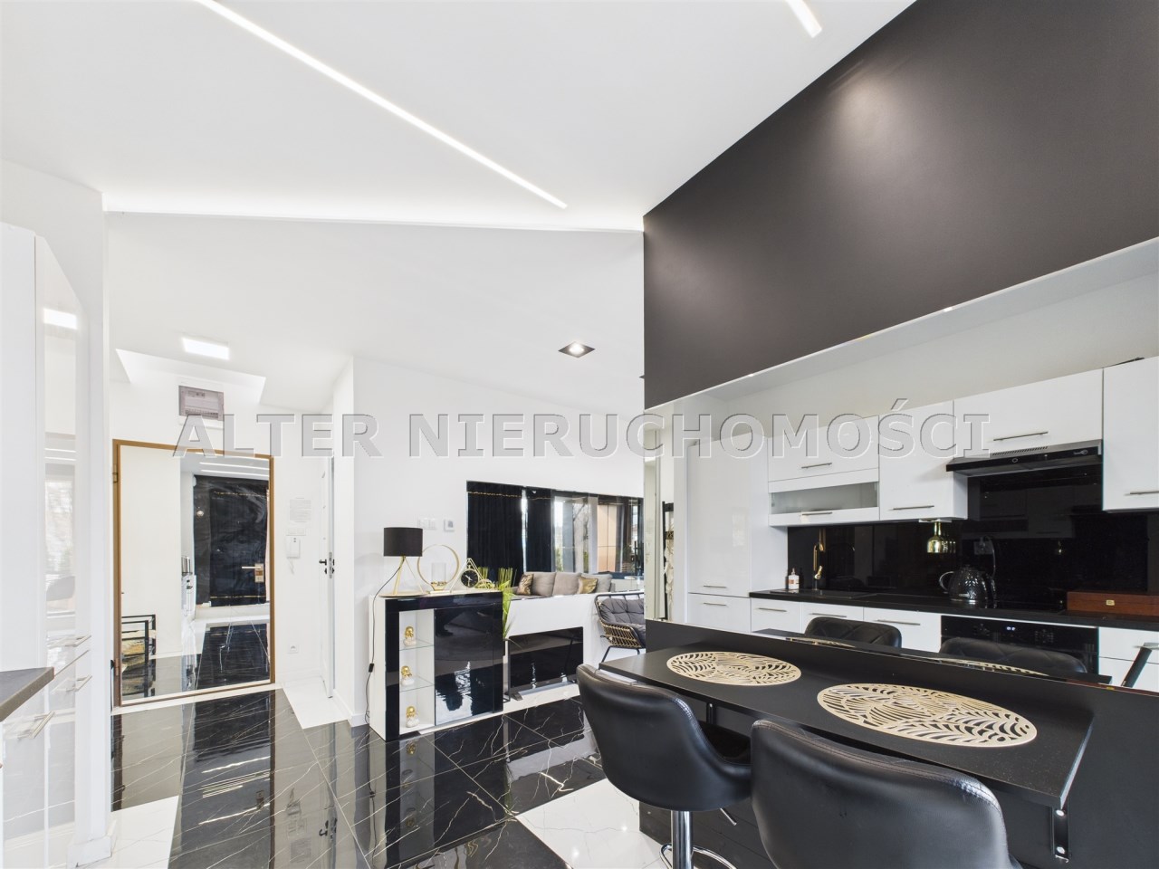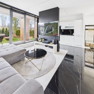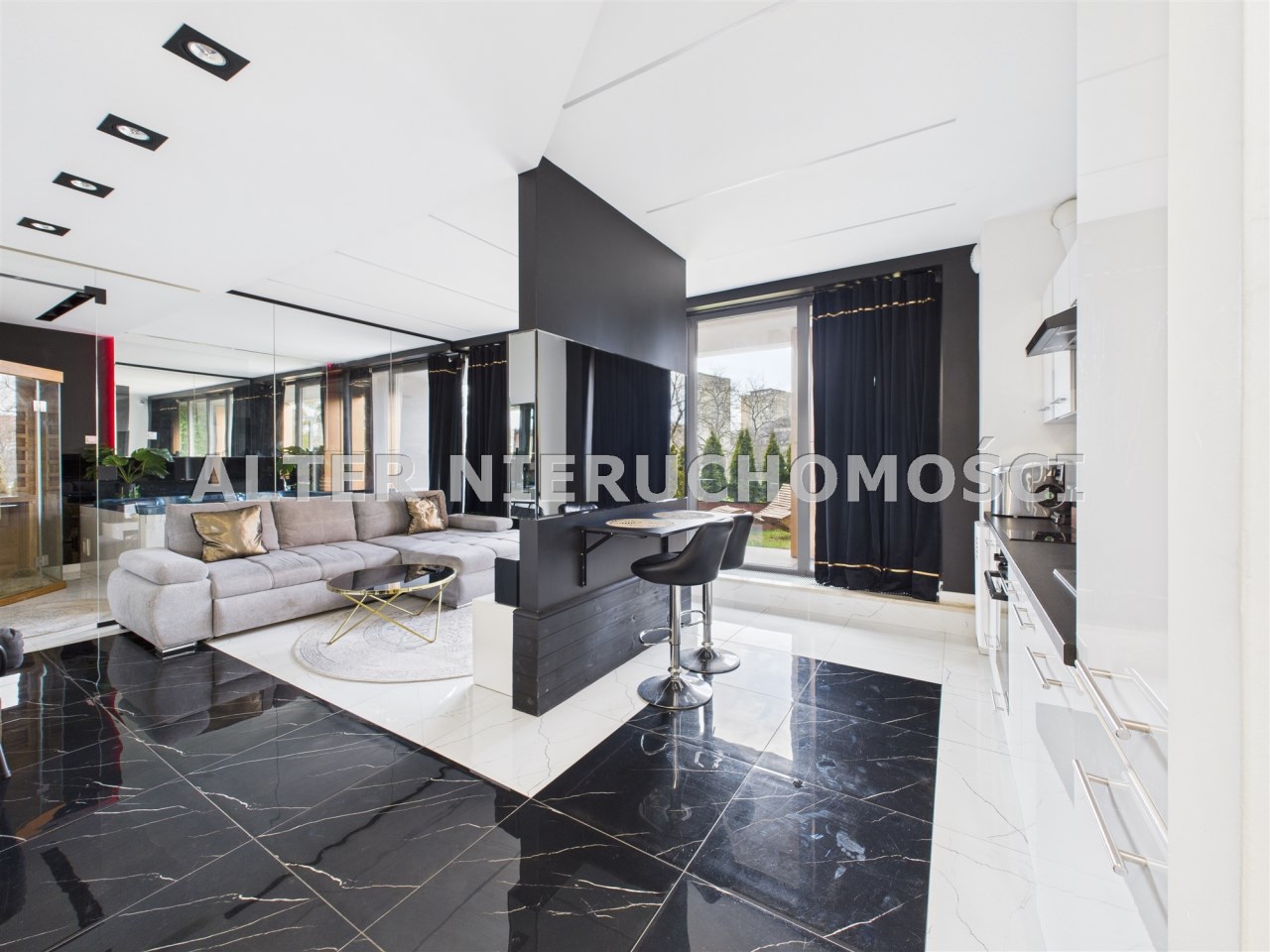 wyposażona kuchnia: ekspres do kawy, piekarnik, lodówkę wraz z zamrażalką, zmywarkę. To wszystko w otoczeniu luster i blasku.