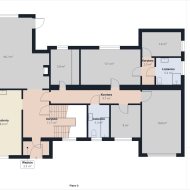 Na piętro prowadzą eleganckie schody. Tam czeka sześć sypialni w tym jedna z  atrakcyjnym pomieszczeniem idealnym na bibliotekę, pracownię lub garderobę oraz dwie łazienki.