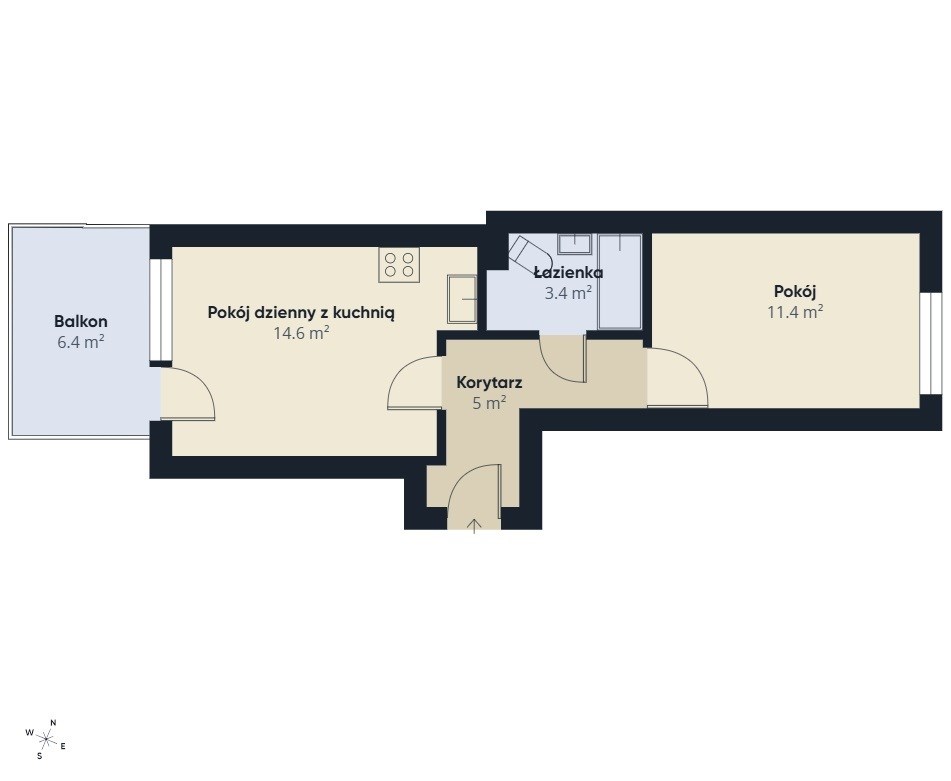 Układ pomieszczeń: strefę dzienną stanowi pokój z aneksem kuchennym (15 m2) oraz wyjściem na loggię (6 m2), sypialnia (11 m2), łazienka z WC (3 m2) oraz korytarz (5 m2).