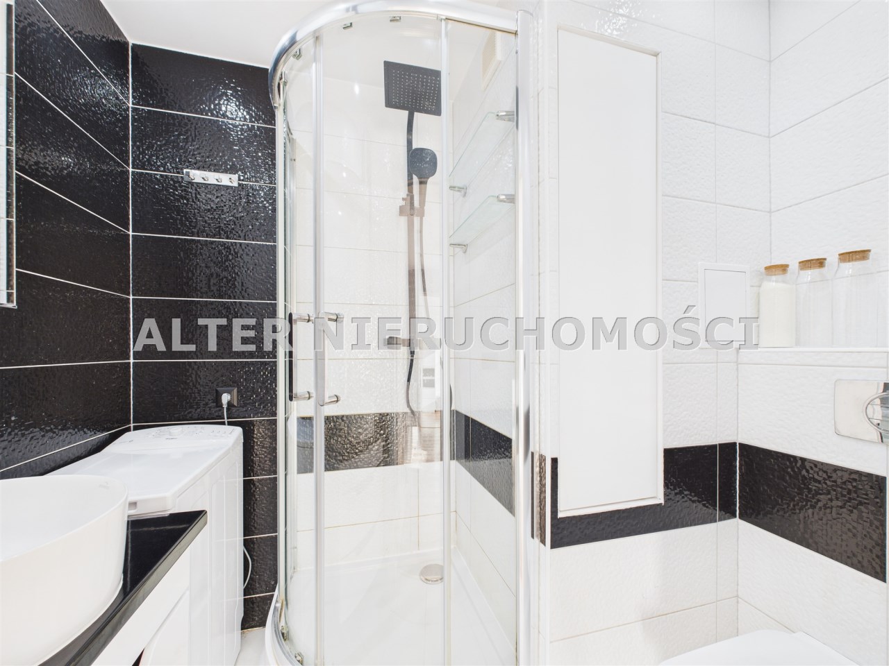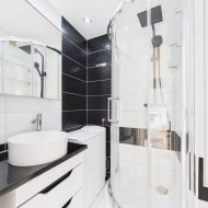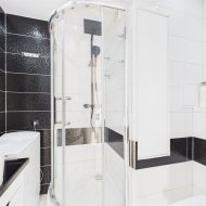 Łazienka (2,5 m²) – wykończona w tonacji czarno-białej - z kabiną prysznicową, umywalką, WC oraz pralką.