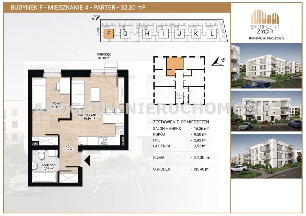 Oferujemy mieszkanie 2- pokojowe nr F4 o powierzchni 32,30m2 zlokalizowane na parterze w kameralnym budynku realizowanym w ramach II etapu inwestycji deweloperskiej "Symfonia Życia " przy ulicy Produkcyjnej w Białymstoku.