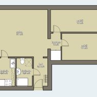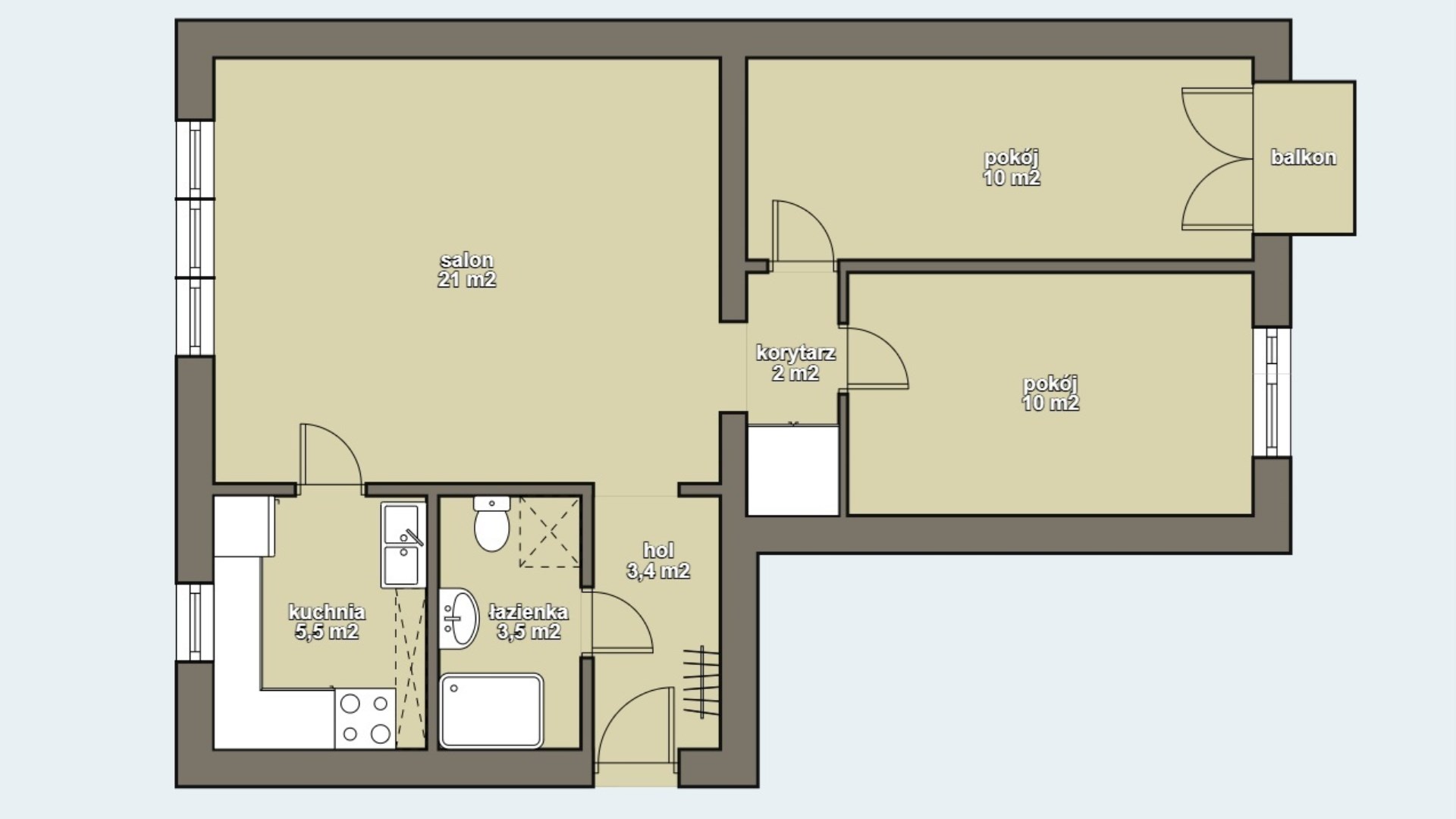 Układ pomieszczeń: strefę dzienną stanowi salon z przejściem do kuchni oraz niewielkiego korytarzyka, z którego wejdziesz do dwóch sypialni, ponadto korytarz oraz łazienka z kabiną prysznicową.