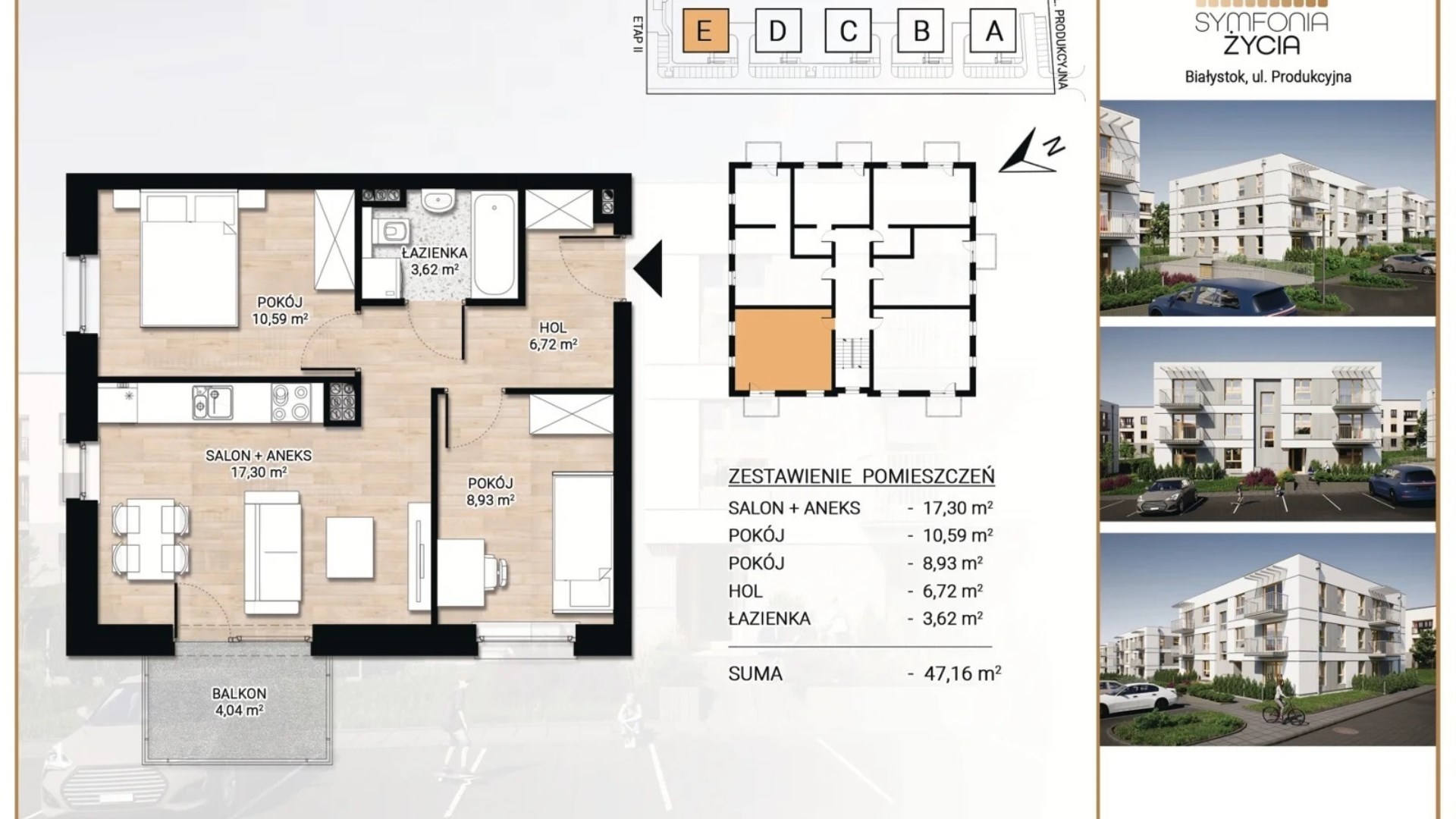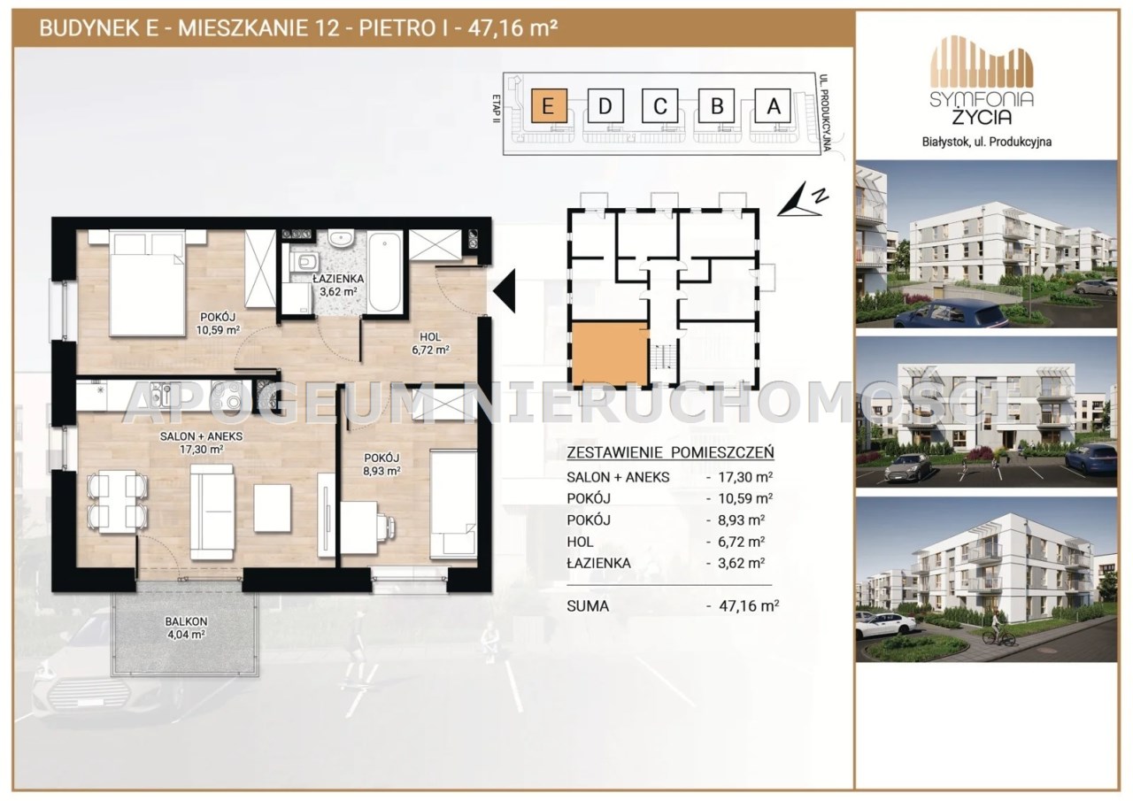 Oferujemy mieszkanie 3- pokojowe nr 12E o powierzchni 47,16m2 zlokalizowane na parterze w kameralnym budynku realizowanym w ramach inwestycji deweloperskiej "Symfonia Życia " przy ulicy Produkcyjnej w Białymstoku.