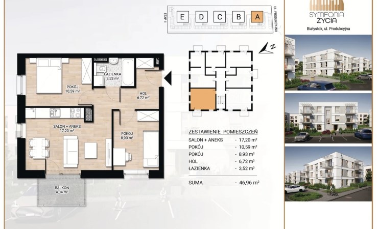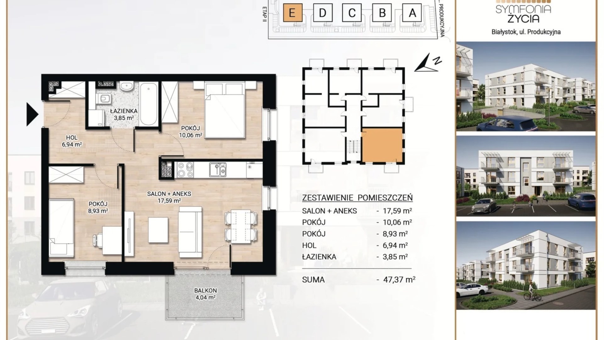 Oferujemy mieszkanie 3- pokojowe nr E7 o powierzchni 47,37m2 zlokalizowane na I piętrze w kameralnym budynku realizowanym w ramach inwestycji deweloperskiej "Symfonia Życia " przy ulicy Produkcyjnej w Białymstoku.