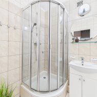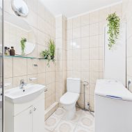 Łazienka: Kompaktowa i przemyślana – z prysznicem, WC oraz wygospodarowanym miejscem na pralkę i szafkę.