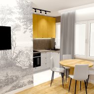 Kuchnia zostanie wyposażona w meble wykonane na wymiar przez stolarza oraz nowy sprzęt AGD na gwarancji/.