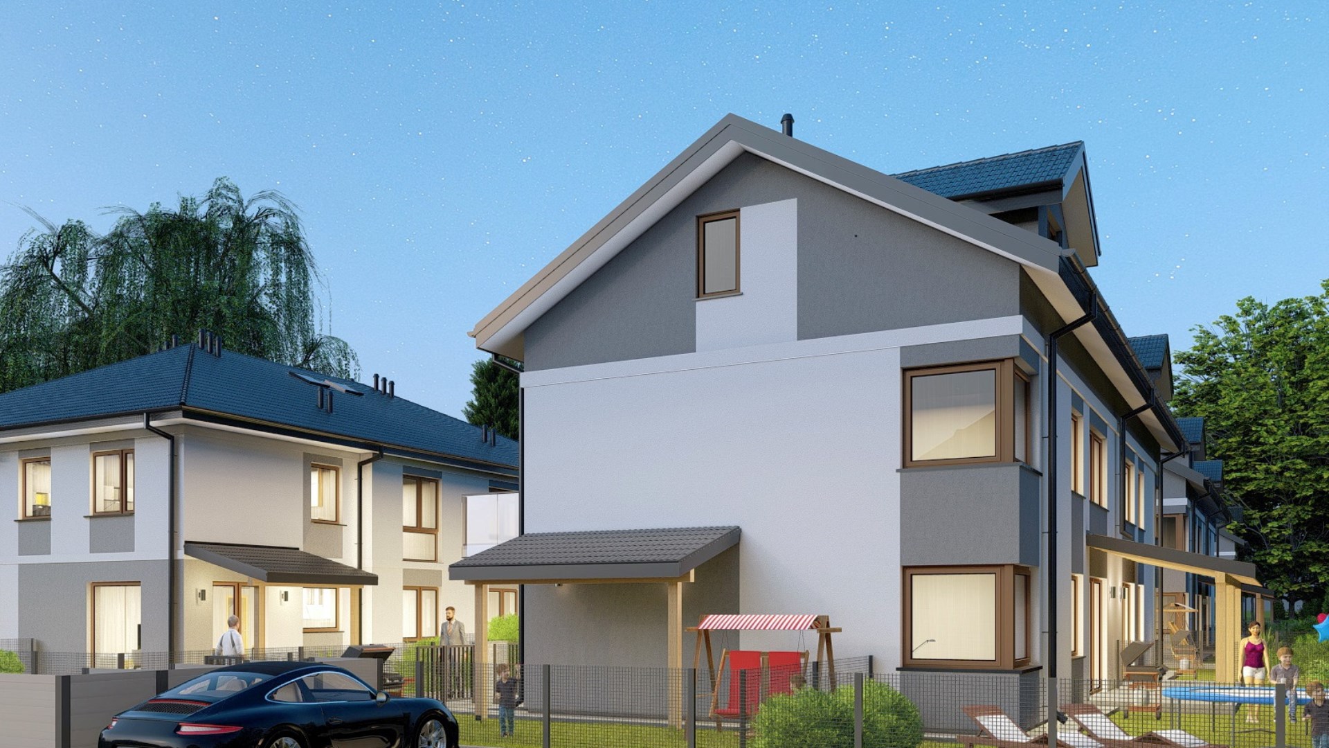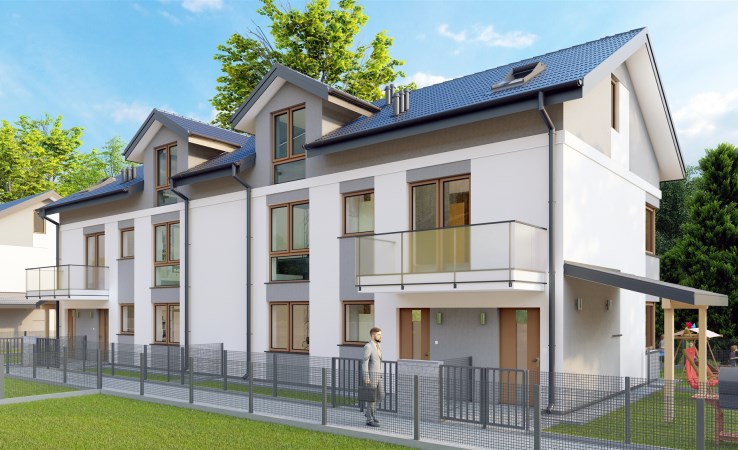 Przestrzeń wokół budynku zostanie starannie zagospodarowana – od drogi dojazdowej wykończonej dekoracyjnym Polbrukiem, przez zadaszoną wiatę w ogródku, po wyodrębnione miejsce na śmietnik. Dodatkowe bezpieczeństwo i wygodę zapewni ogrodzenie ogródka.