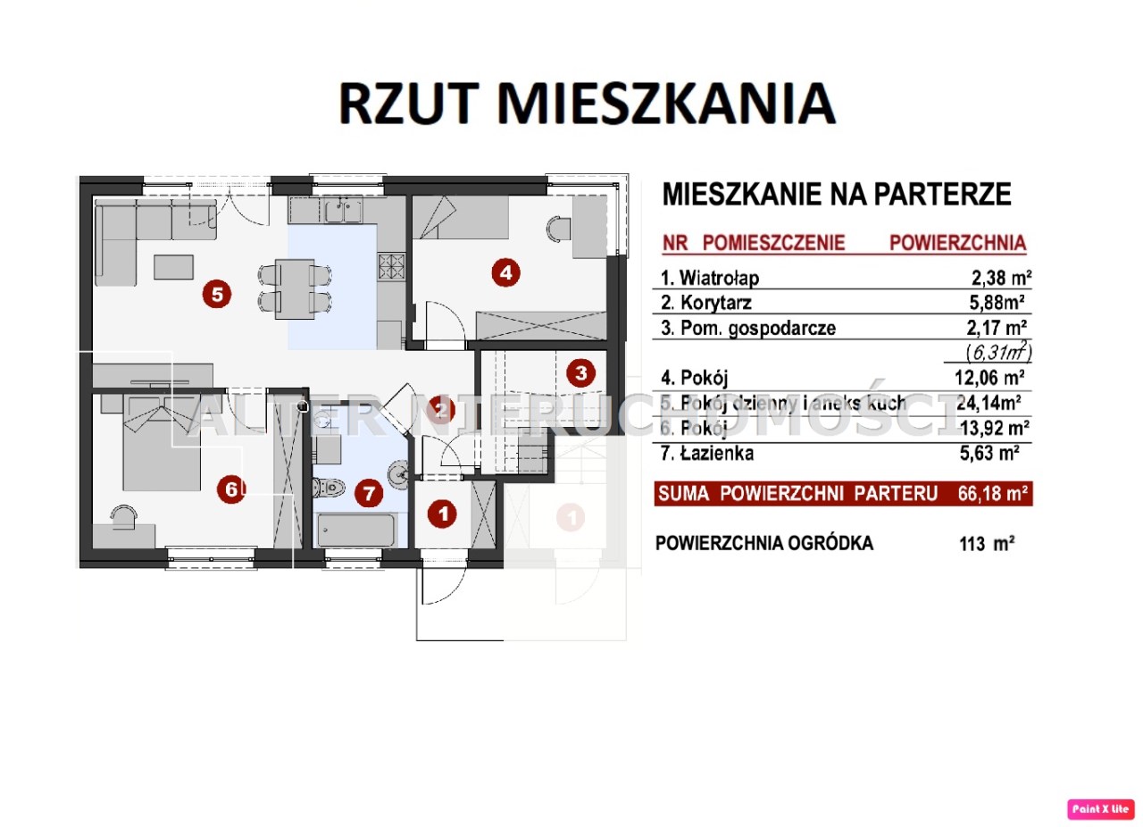 – Powierzchnia 66,18 m² na Parterze, to doskonale rozplanowane wnętrze. Znajduje się przytulne trzypokojowe mieszkanie: salon z aneksem kuchennym (24 m²), dwie niezależne sypialne (12 i 14 m²), łazienka (5,6 m²) oraz korytarz z wiatrołapem.