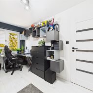Dzięki indywidualnemu projektowi i zaokrąglonym ścianom korytarza, przestrzeń została optymalnie wykorzystana, zyskując na funkcjonalności.
