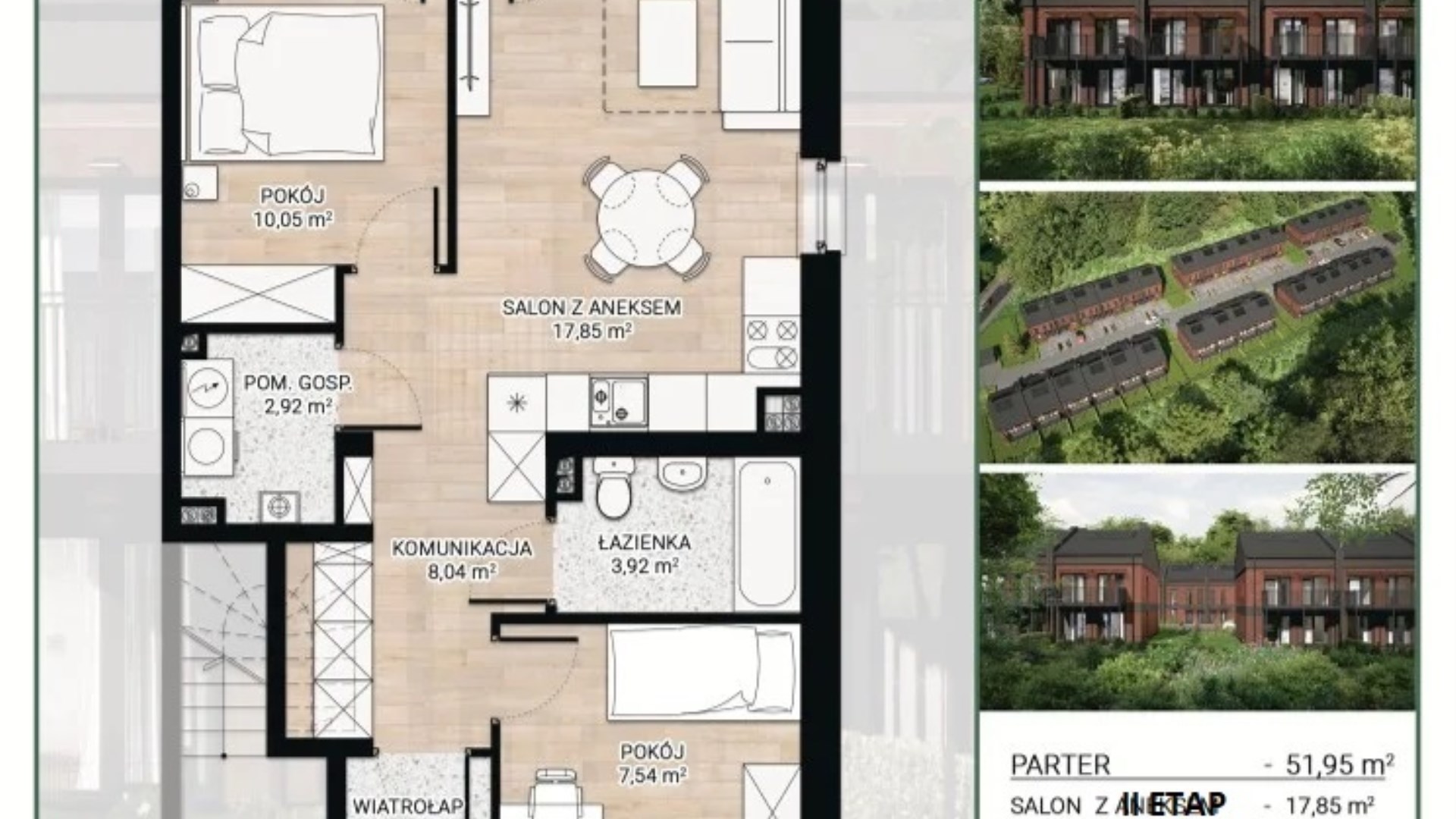 Oferujemy do sprzedaży mieszkanie 3- pokojowe 17A o powierzchni 51,95 m2 w budynku w zabudowie szeregowej w trakcie realizacji.