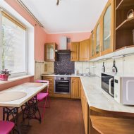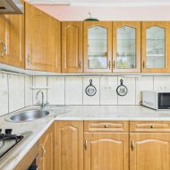 Oddzielna kuchnia wyposażona jest w zabudowę stałą oraz wszystkie niezbędne sprzęty AGD – kuchenkę, okap, lodówkę i mikrofalówkę.